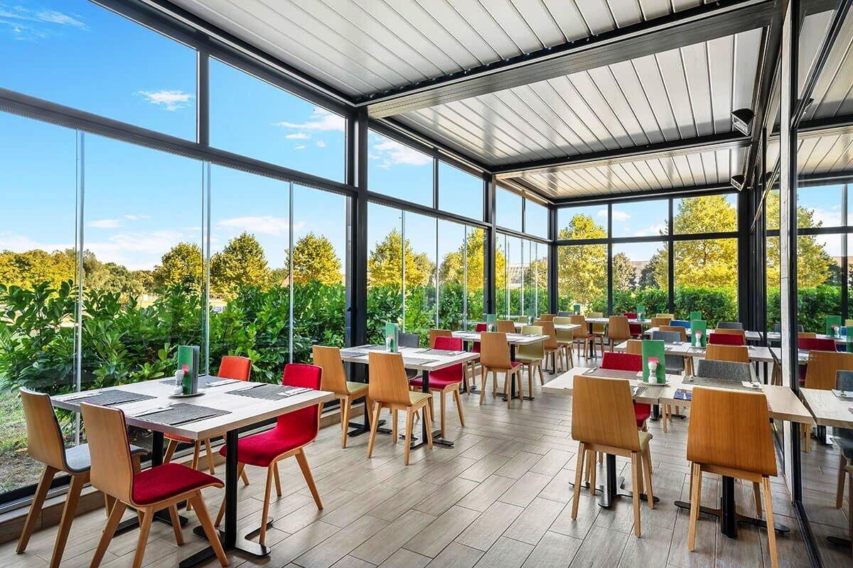 areálem krytou chodbou, recepce, 2 restaurace, s maďarskou a