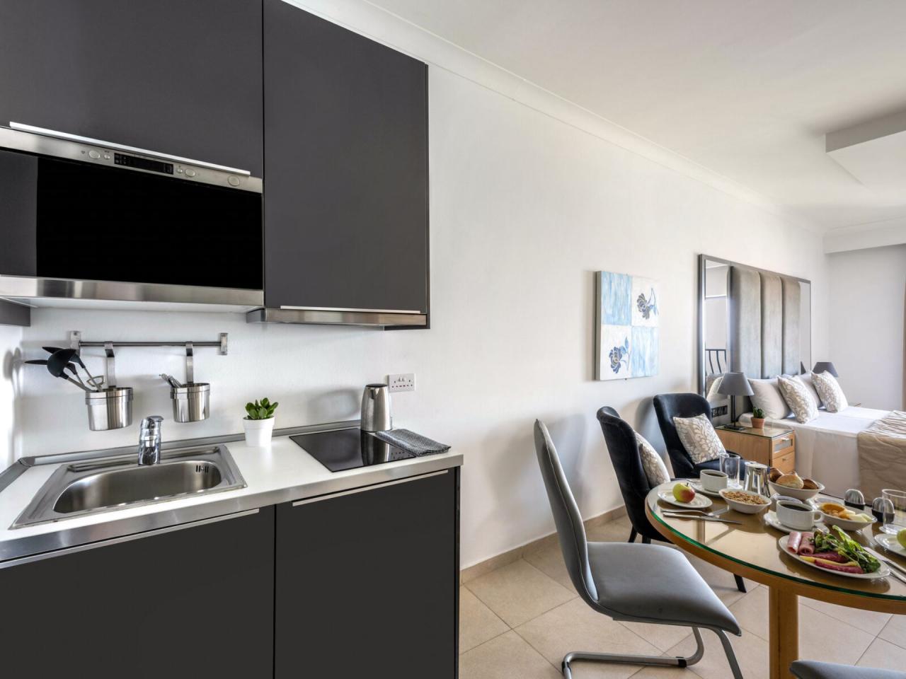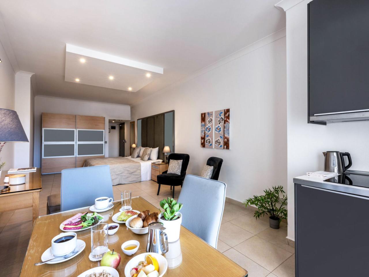 Studio je vybaveno stejně jako standardní dvoulůžkový pokoj, má navíc vybavený kuchyňský kout (indukční varnou desku, mikrovlnnou troubu, lednici s mrazákem, rychlovarnou konvici, toustovač a veškeré základní kuchyňské vybavení) a nádobí.