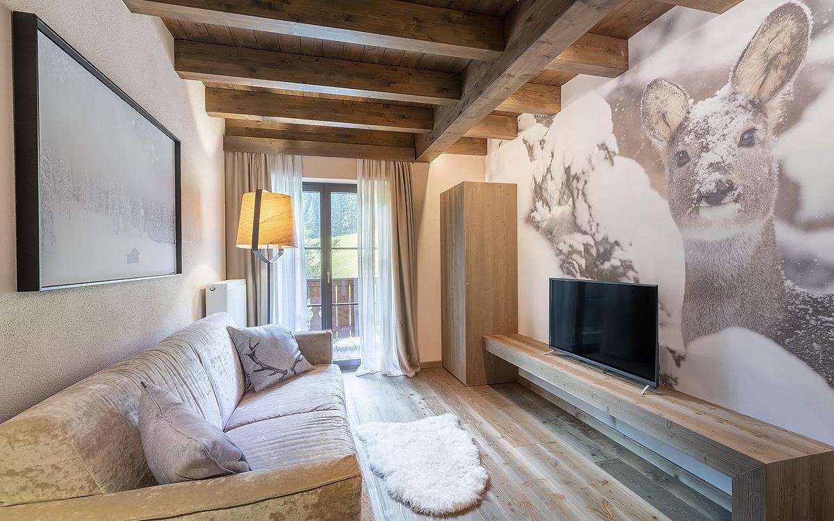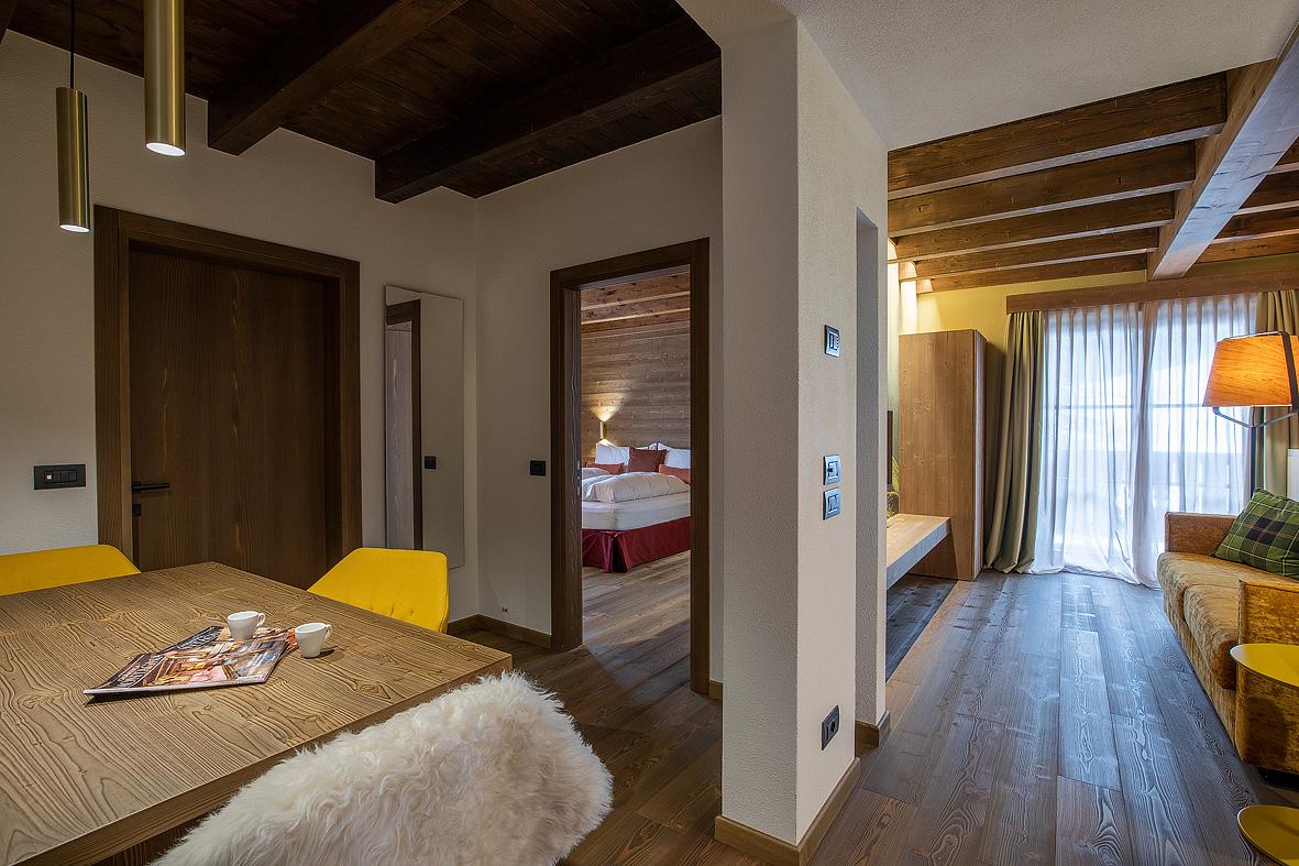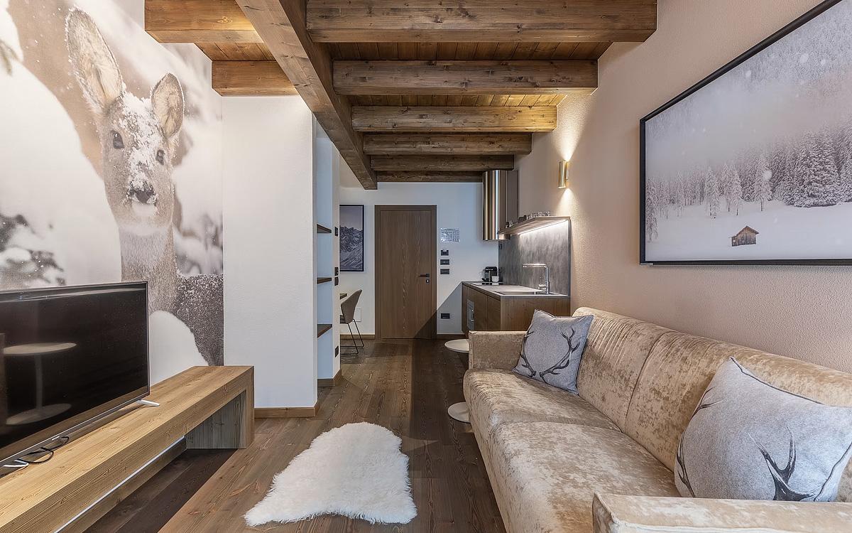 #bilo 4 Tre Cime: 50 m² - 1 ložnice s manželskou postelí, obývací pokoj s kuchyňským koutem a rozkládacím gaučem pro 2 osoby, sociální zařízení, balkon; nelze ubytovat děti mladší 3 let