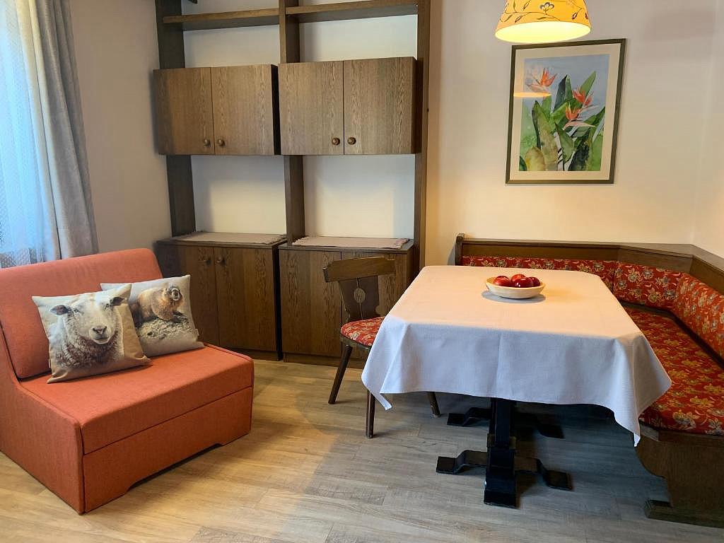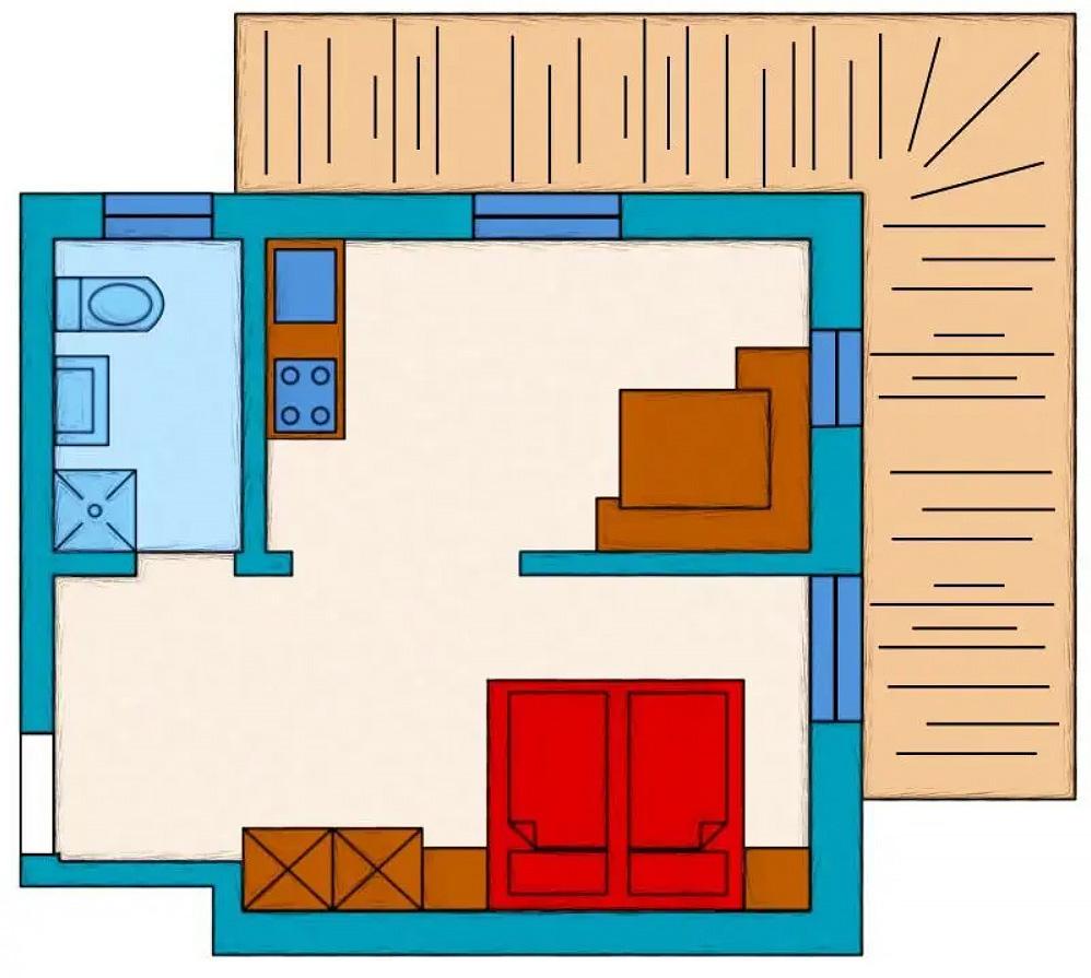 #bilo 2+1 Dolomiti: 28 až 36 m² - 1 ložnice s manželskou postelí, obývací pokoj s kuchyňským koutem a rozkládacím gaučem pro 1 osobu, 2x sociální zařízení se sprchou, balkon či terasa s výhledem na Dolomity; maximální obsazenost apartmánu jsou 2 dospělé osoby a 1 dítě do nedovršených 14 let