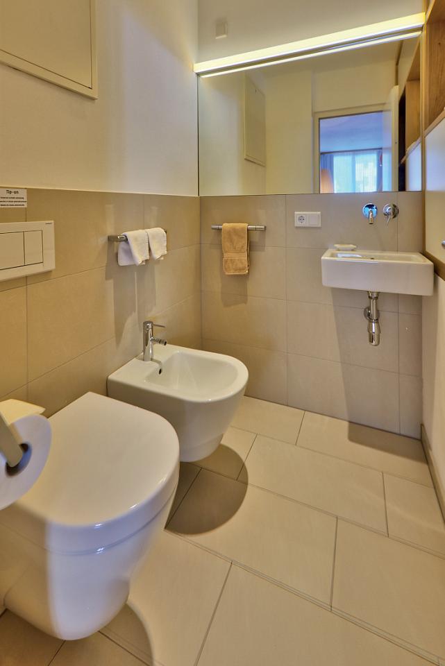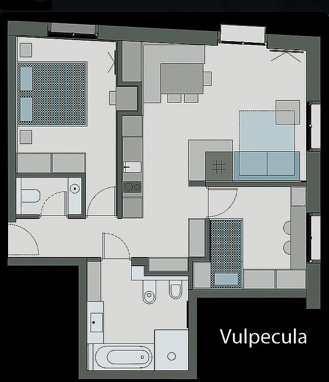#trilo 6 Vulpecula: 65 m² - 1 ložnice s manželskou postelí, 1 ložnice s palandou, obývací pokoj s kuchyňským koutem a rozkládacím gaučem pro 2 osoby, sociální zařízení (u 1 apartmánu se sprchou i vanou), 1x WC navíc