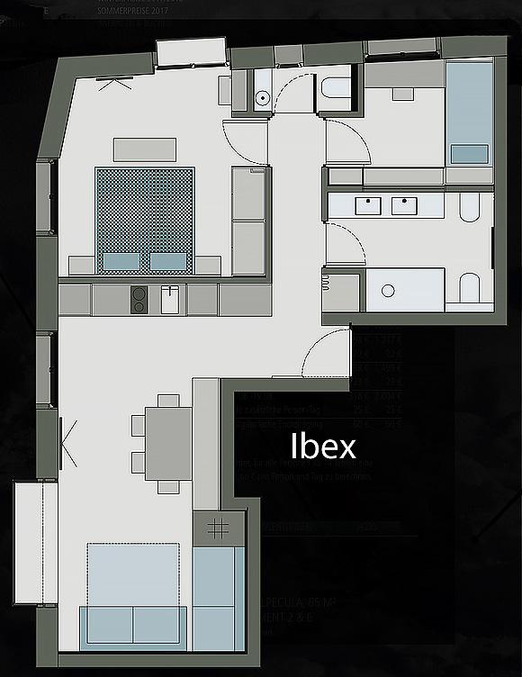 #trilo 6 Ibex: 62 m² - 1 ložnice s manželskou postelí, 1 ložnice s palandou, obývací pokoj s kuchyňským koutem a rozkládacím gaučem pro 2 osoby, sociální zařízení