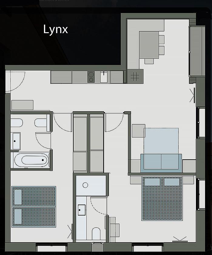 #trilo 6 Lynx: 72 m² - 2 ložnice s manželskou postelí, obývací pokoj s kuchyňským koutem a rozkládacím gaučem pro 2 osoby, 2x sociální zařízení (1x se sprchou, 1x s vanou; vstup z ložnice), malý balkon